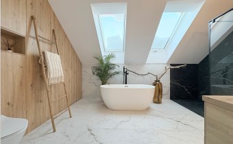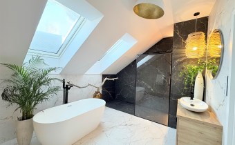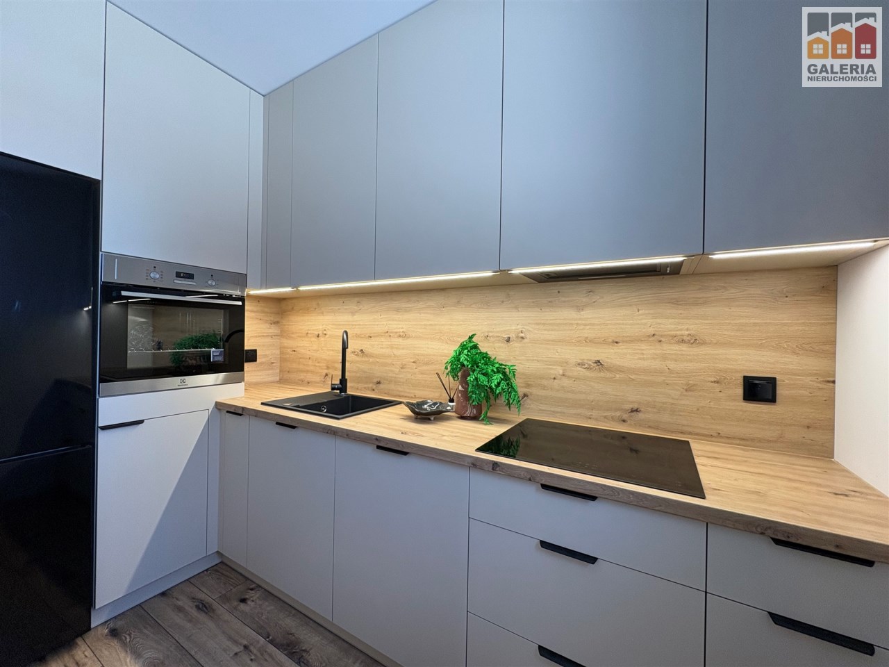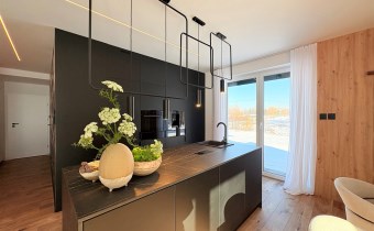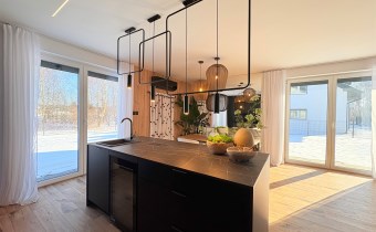 Kuchnia została zaprojektowana z myślą o maksymalnym komforcie – otwarta na jadalnię i salon, z ukrytymi drzwiami prowadzącymi do tzw. „brudnej kuchni”. Dzięki temu część reprezentacyjna zawsze pozostaje idealnie uporządkowana.