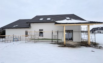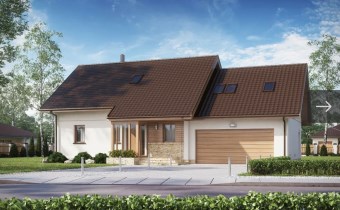 Dom realizowany na bazie projektu D-186 z pracowni Extradom.pl, przy czym w trakcie budowy wprowadzono zmiany zwiększające funkcjonalność i komfort użytkowania. Na poddaszu podniesiono ścianę kolankową do wysokości ok. 135 cm, co znacząco powiększa przestrzeń użytkową i ułatwia aranżację pomieszczeń.