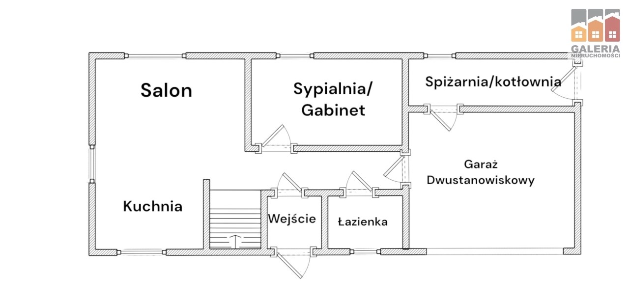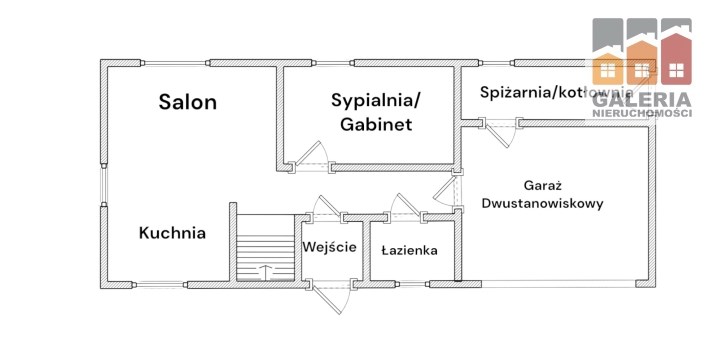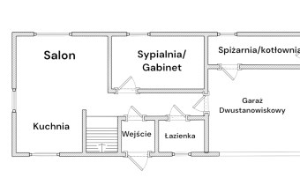 - salon, jadalnia, kuchnia, sypialnia/gabinet, łazienka, przedpokój, hol, kotłownia, pomieszczenie gospodarcze, garaż dwustanowiskowy